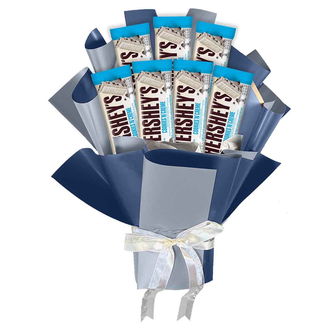 Indulge in the sweetest delight with our one-of-a-kind Hershey Bouquet! A harmonious fusion of artisanal craftsmanship and decadent confections, this extraordinary creation will dazzle your senses. Immerse yourself in a lavish assortment of rich Hershey's chocolates meticulously arranged in a stunning floral arrangement. Each velvety-smooth piece offers a symphony of flavors, from classic dark chocolate to Cookies & Creme and beyond. Whether as a heartfelt gift or a centerpiece for your special occasions, the Hershey Bouquet is a captivating masterpiece that will leave chocolate enthusiasts longing for more. Elevate your chocolate experience to new heights and savor the unrivaled pleasure of this exquisite bouquet.
